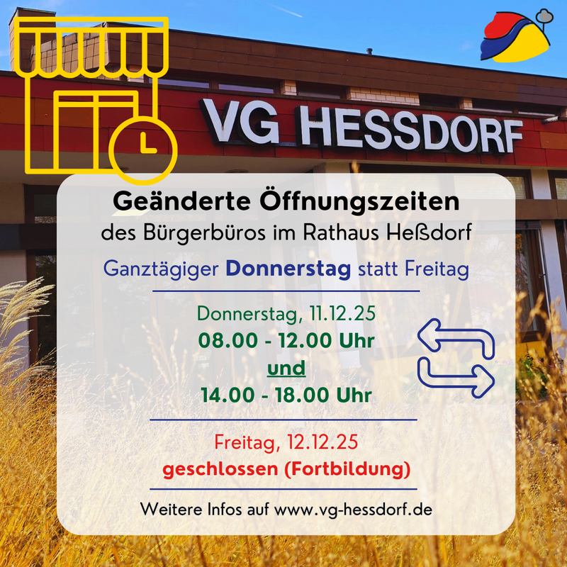 Bitte beachten Sie die geänderten Öffnungszeiten des Bürgerbüros (Einwohnermeldeamt, Passamt, Fundamt) im Dezember. Wegen Fortbildung der Mitarbeiter können wir in Kalenderwoche 50, am Freitag (12.12.25) das Bürgerbüro nicht öffnen.