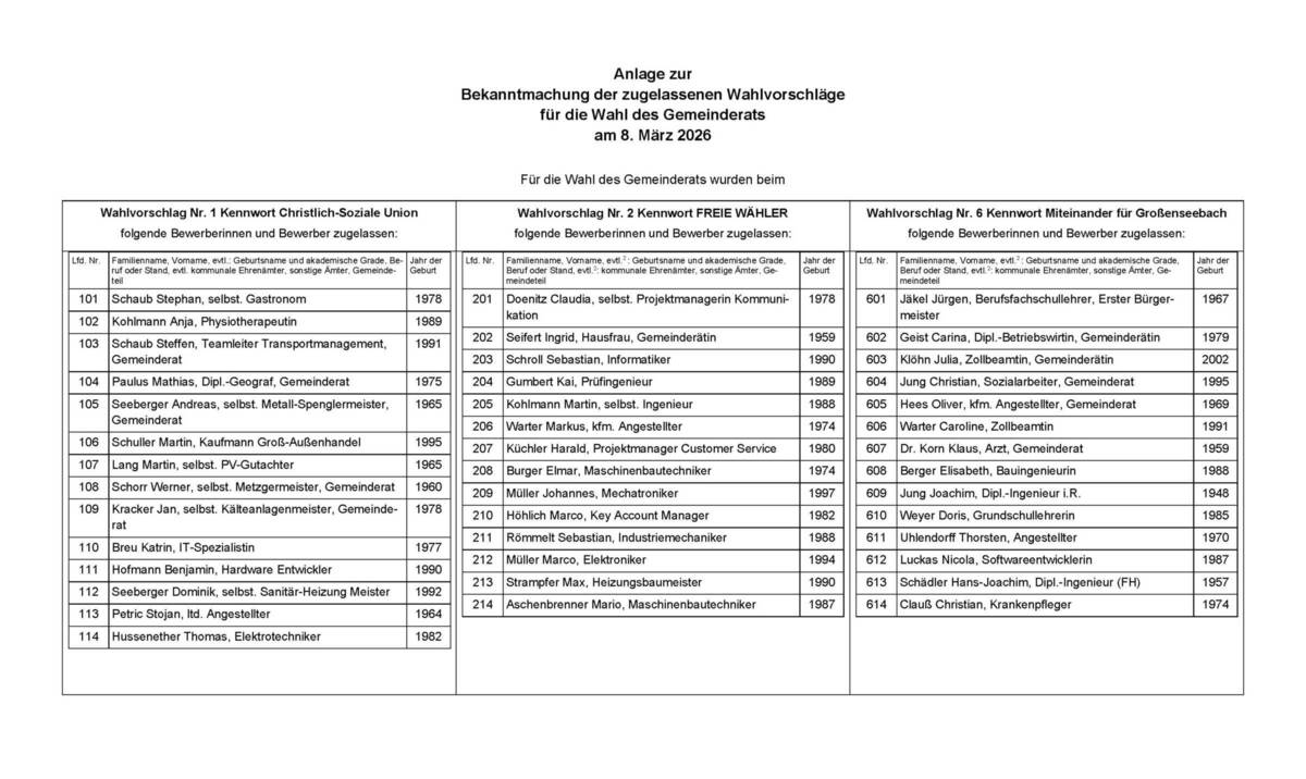Bekanntmachung der Gemeinde Großenseebach zur Kommunalwahl 2026 über die gelassenen Wahlvorschläge für die Wahl des Ersten Bürgermeisters am 08. März 2026
