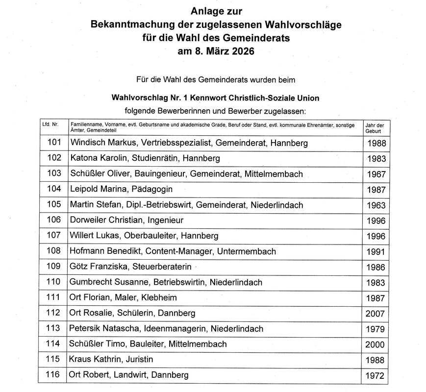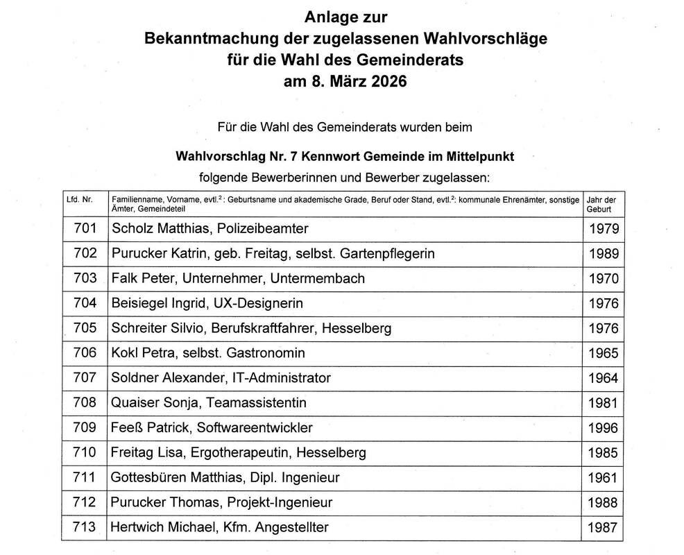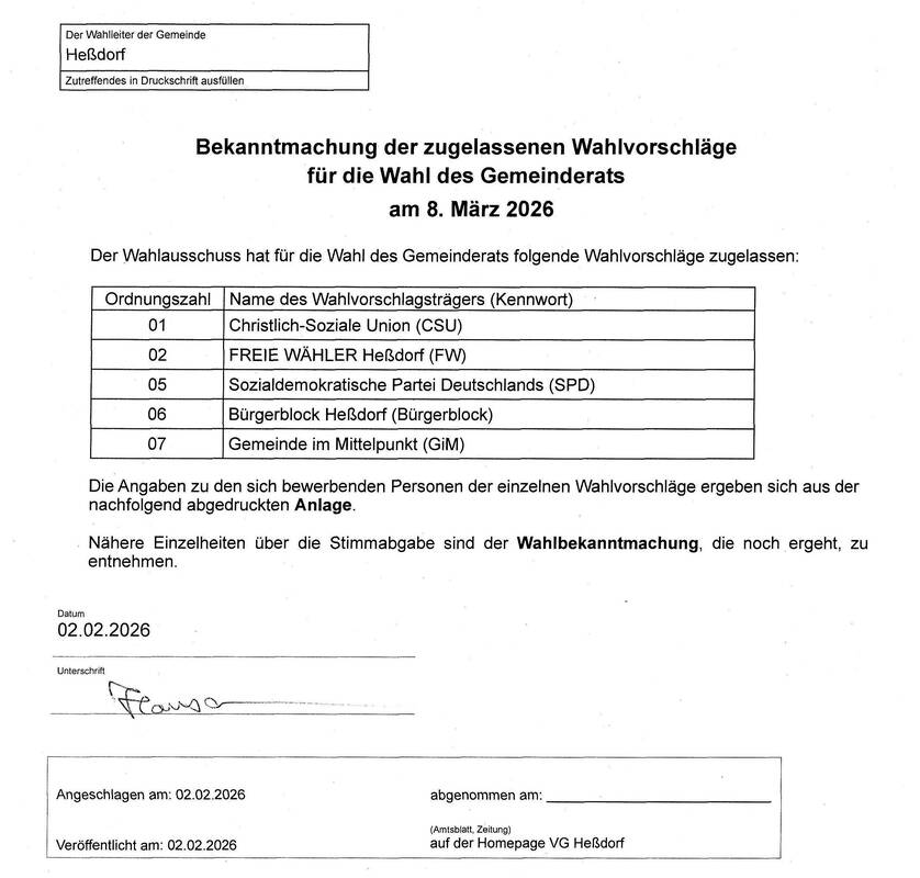 Bekanntmachung der Gemeinde Großenseebach zur Kommunalwahl 2026 über die gelassenen Wahlvorschläge für die Wahl des Ersten Bürgermeisters am 08. März 2026