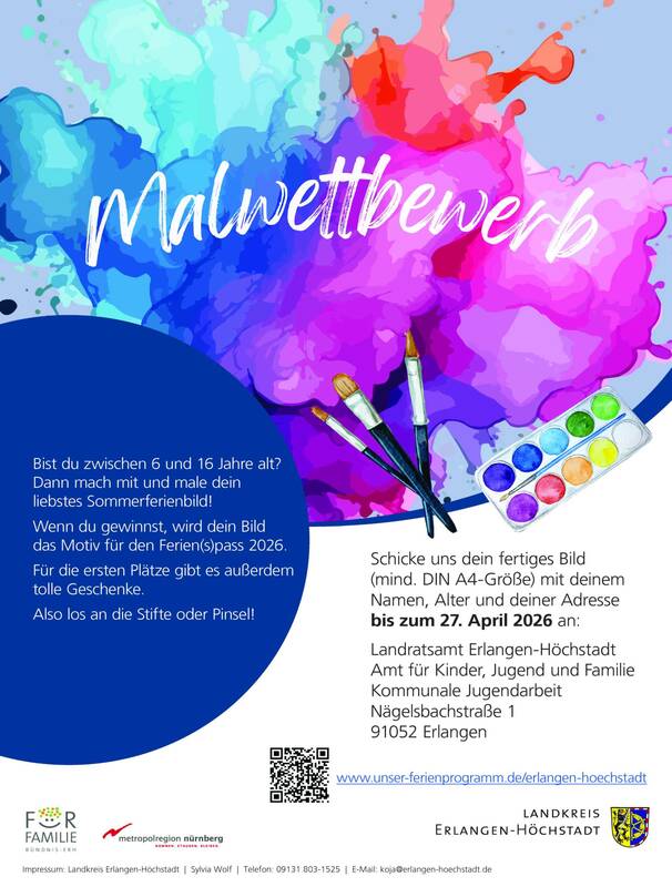 Kinder und Jugendliche zwischen sechs und 16 Jahren können bei dem Malwettbewerb mitmachen und ihre Vorschläge samt Name, Alter und Anschrift per Post an Sylvia Wolf, Amt für Kinder Jugend und Familie/Kommunale Jugendarbeit, Nägelsbachstraße 1, 91052 Erlangen bis 27. April 2026 schicken.