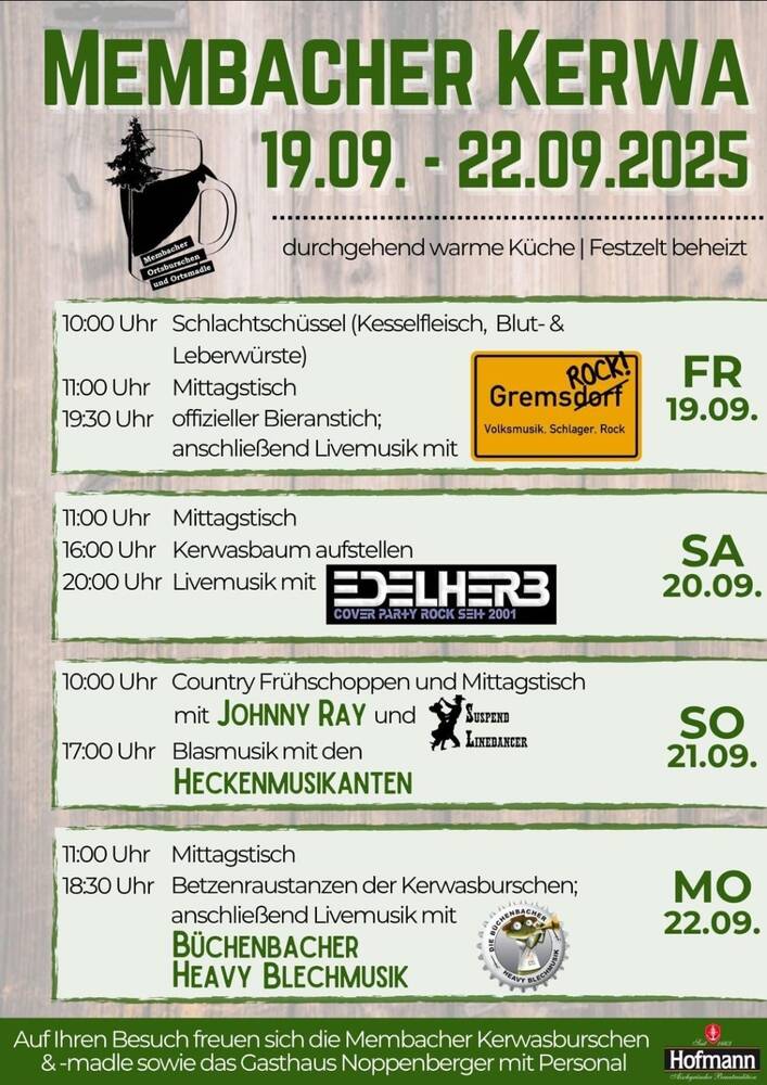 Auf Ihren Besuch freuen sich die Membacher Kerwasburschen und Madli und das Gasthaus Noppenberger mit Personal.
