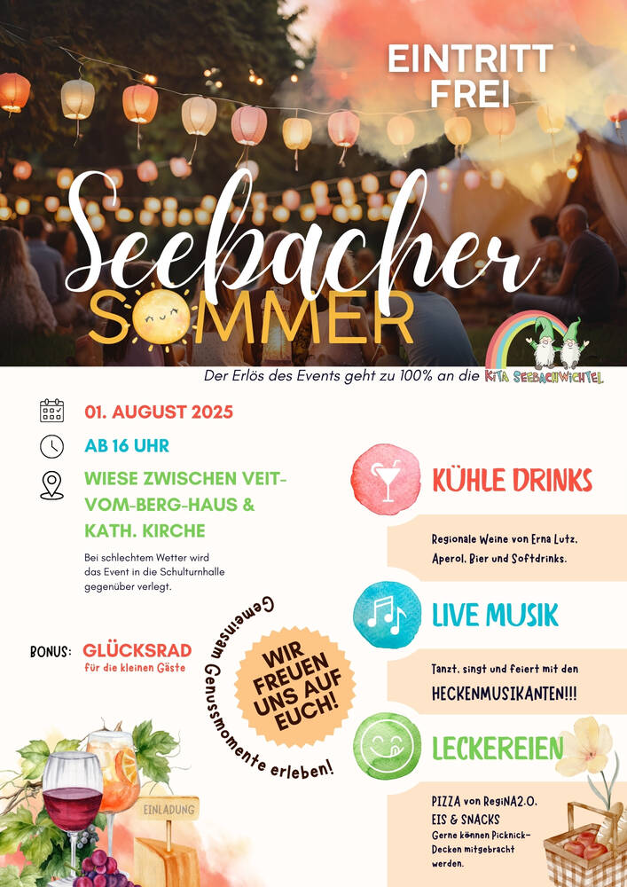 Der Elternbeirat der Kita Seebachwichtel lädt alle Bürgerinnen und Bürger der Gemeinde ans Veit-vom-Berg-Haus ein zum geselligen Beisammensein bei Live Musik, kühlen Drinks, leckere Pizza, Eis und Snacks. Für die kleinen Gäste gibt es auch ein Glücksrad.